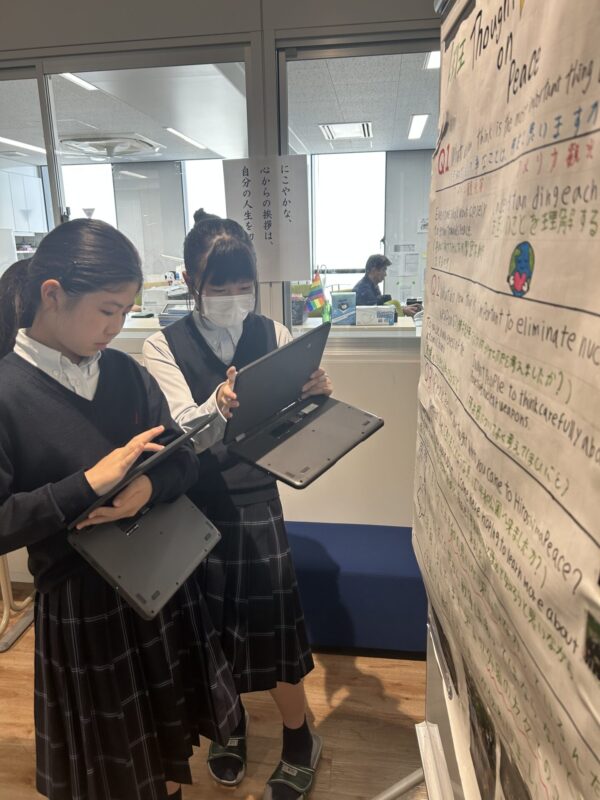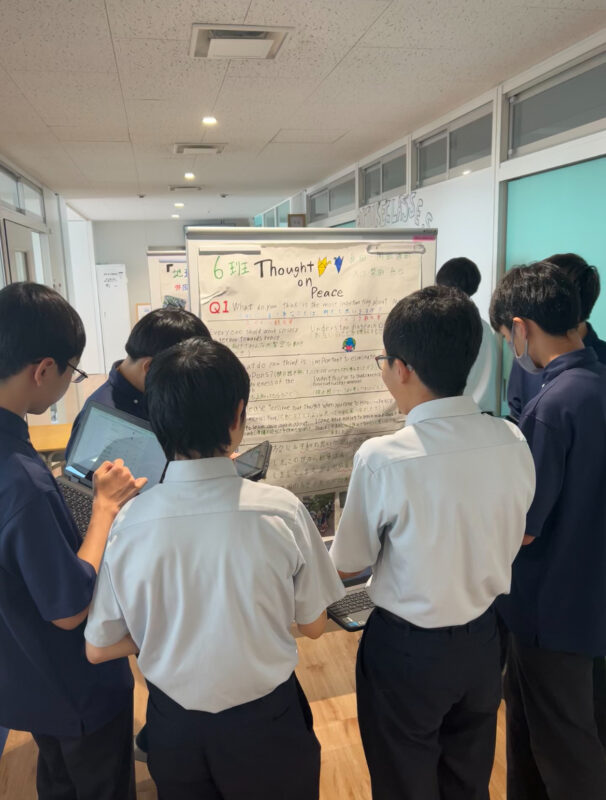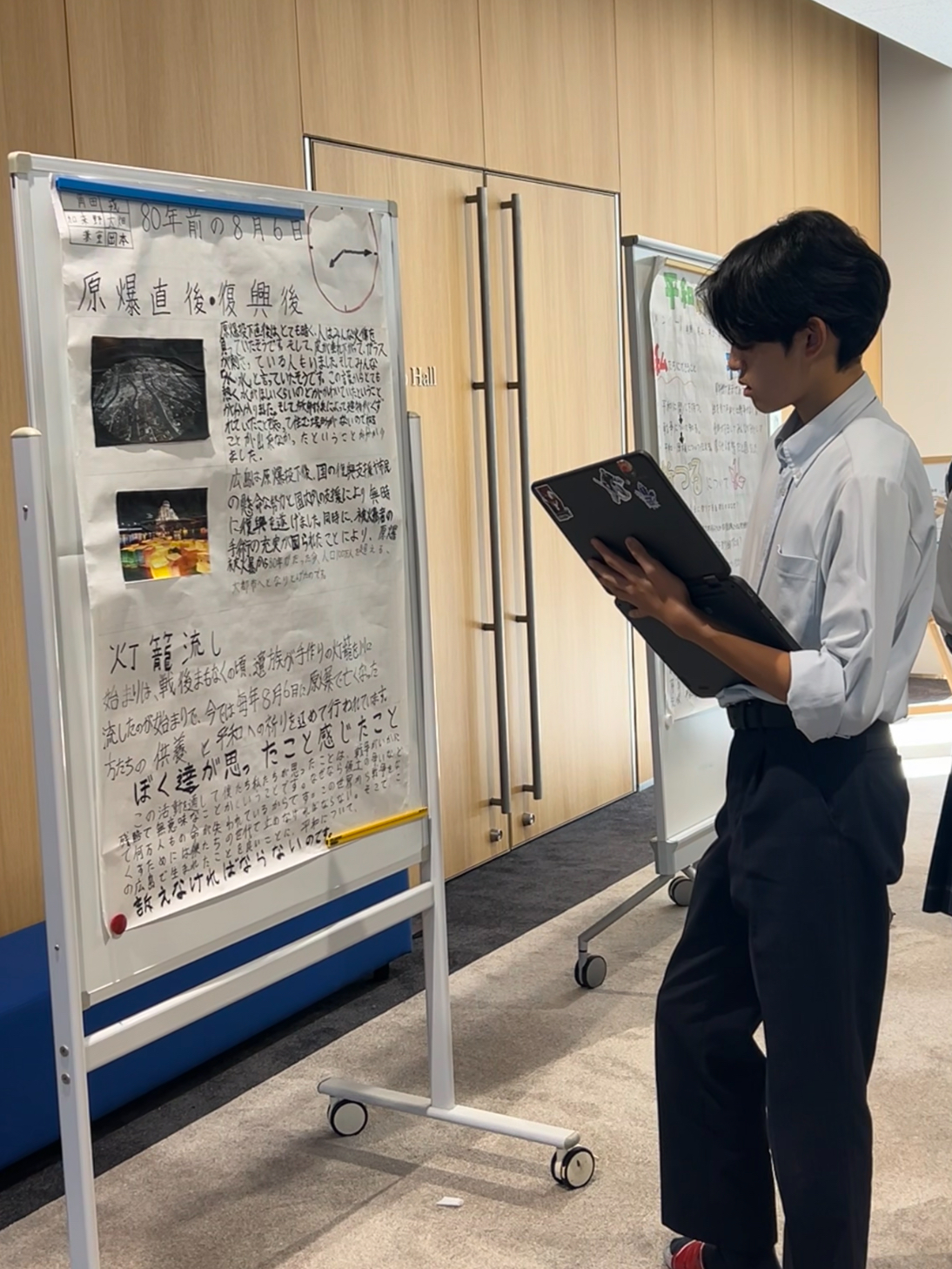 先日の中学校のLHRでは、ポスタービューイングを実施しました。1学期に行なわれた平和学習での学びをポスターにまとめ、全学年の作品を見てまわるイベントです。作成されたポスターは学年ごとに分けて掲示されました。生徒たちは一つ一つの作品に目を通し、印象に残ったものに投票していきます。
