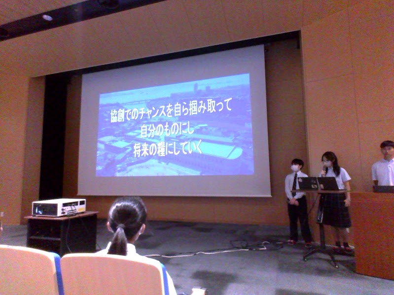 また、写真は先日行われた第2回オープンスクールでも発表した学校紹介を中学生全体に報告している様子です。もちろん発表者は生徒です。