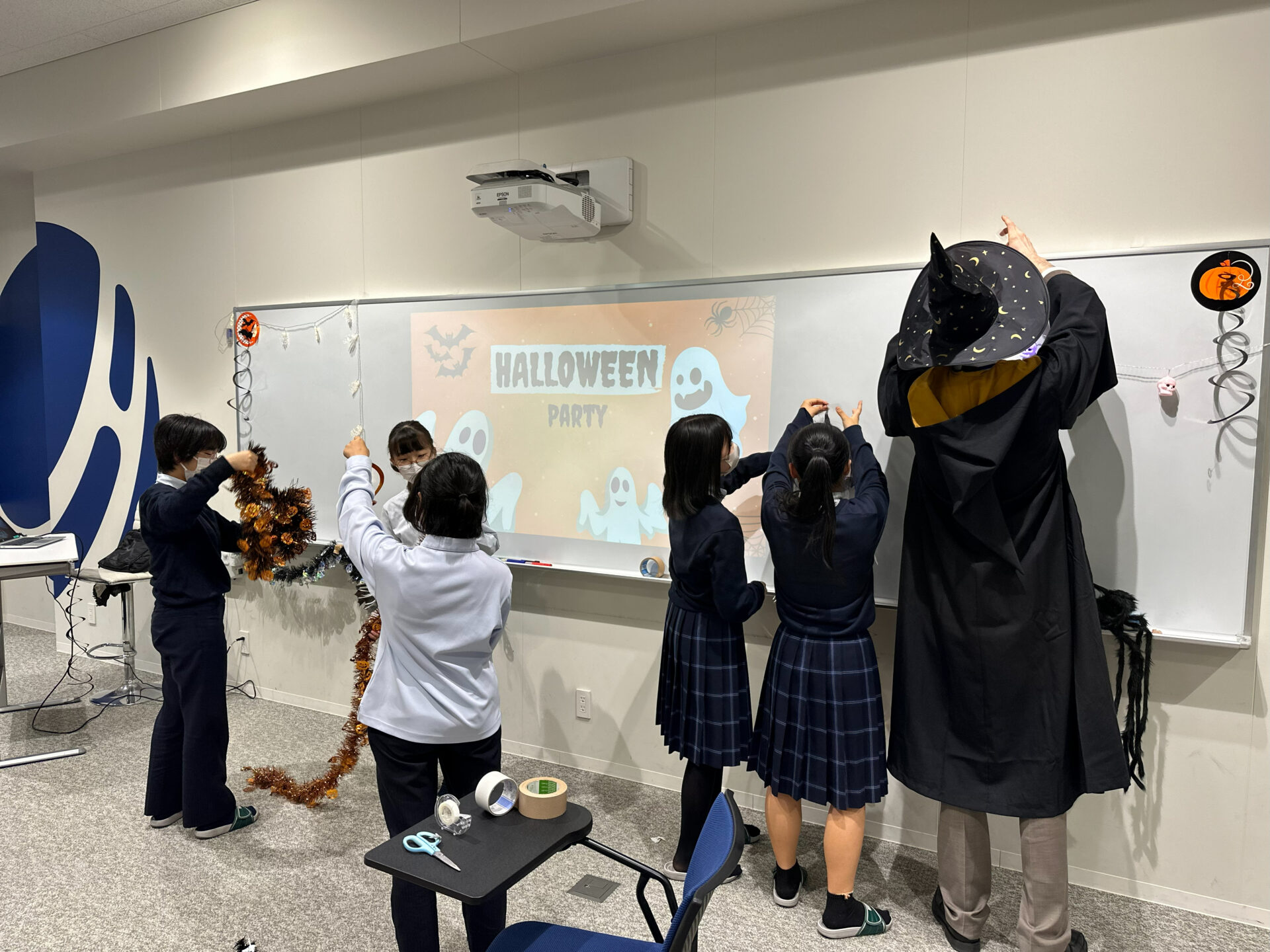 今回のパーティではまず、英語同好会の部員たちが準備としてE-Roomをハロウィン使用に飾りつけを施しました。