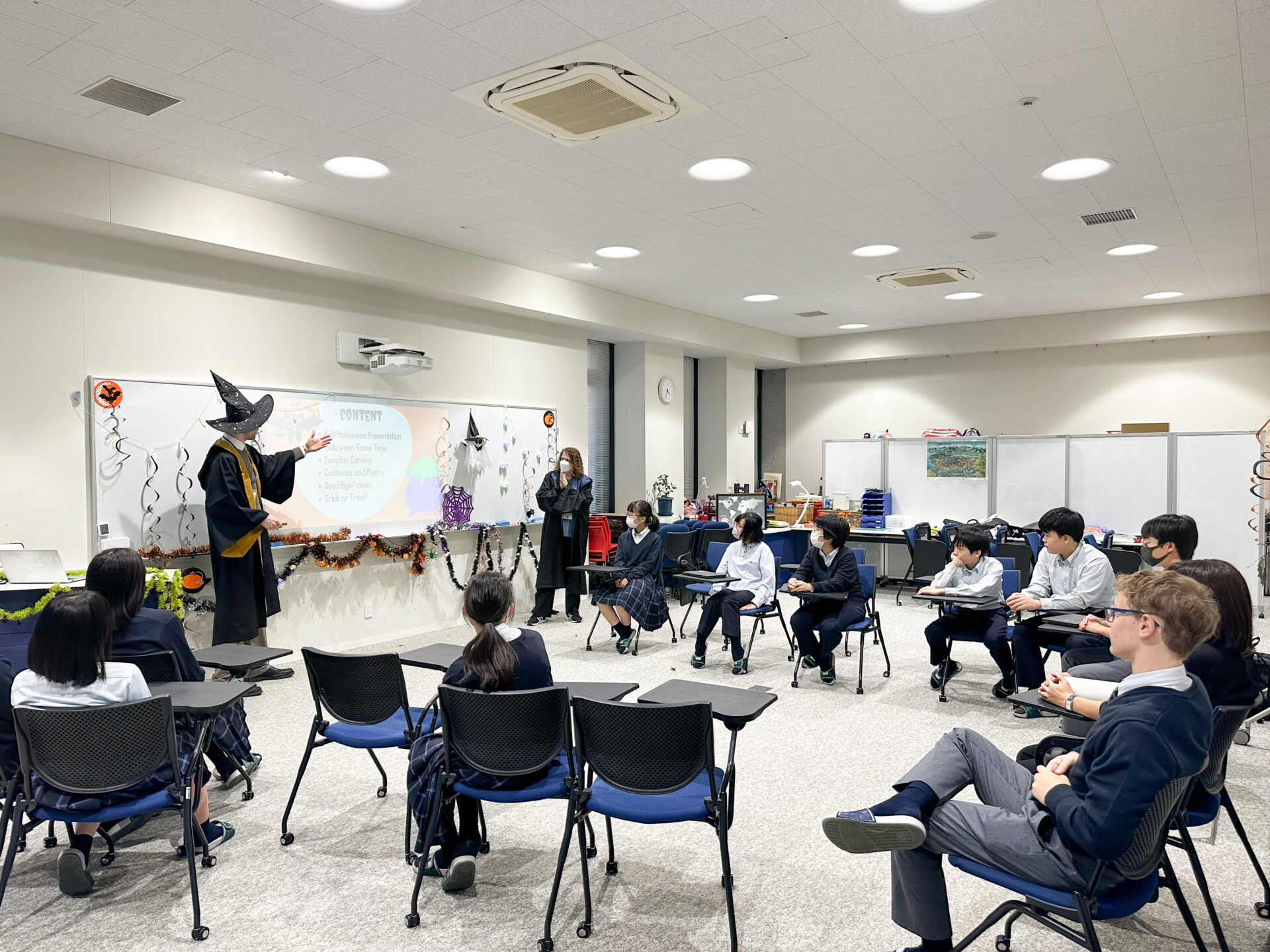 パーティではまず、Matt先生から「ハロウィンとは何だろう」というテーマで話があり、参加した生徒たちは日本の秋のイベントとハロウィンを比較しながら考えたり、「ハロウィンを楽しむこと」について議論を交わしたりと、異文化を知り、楽しむ時間を持つことができました。