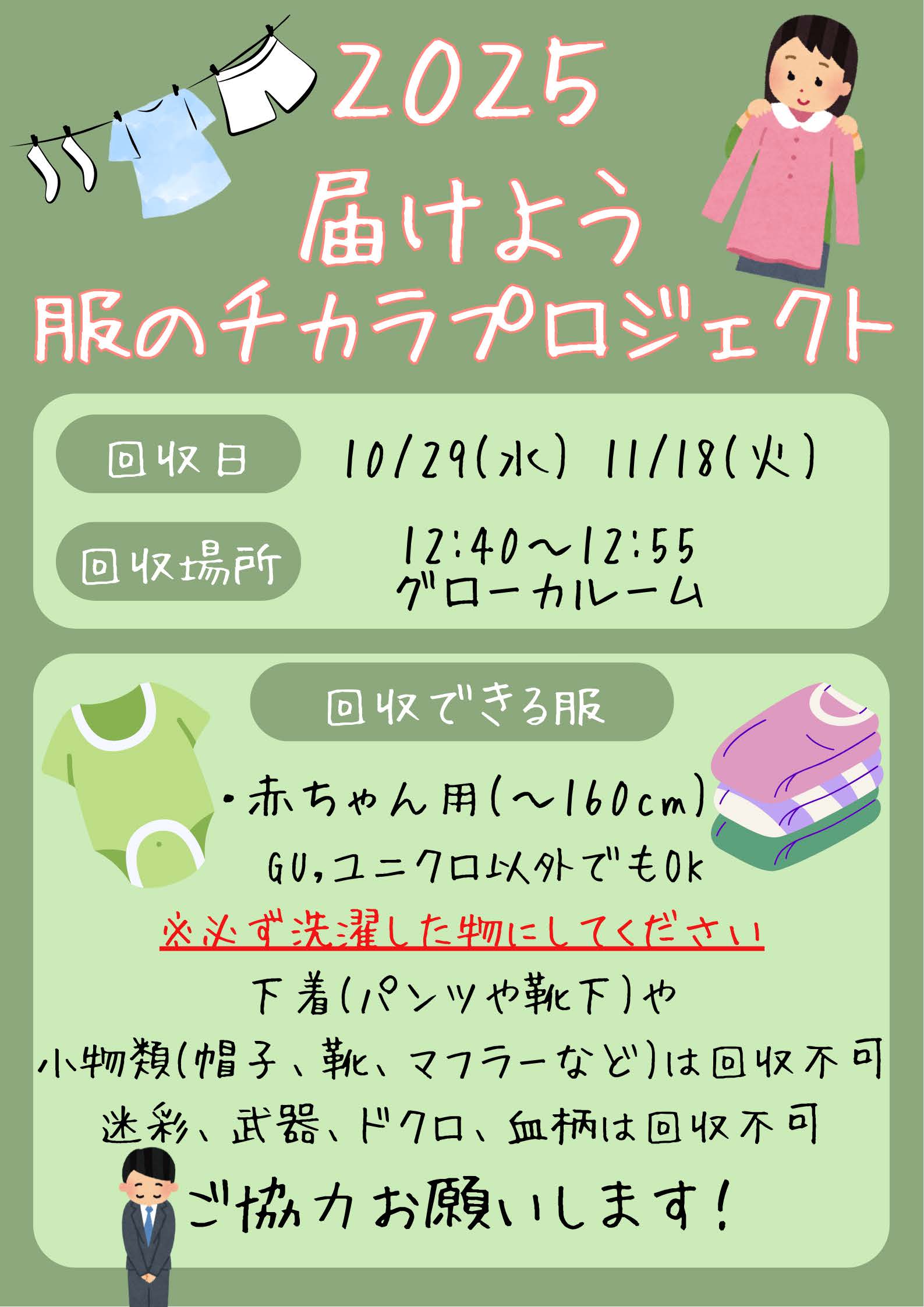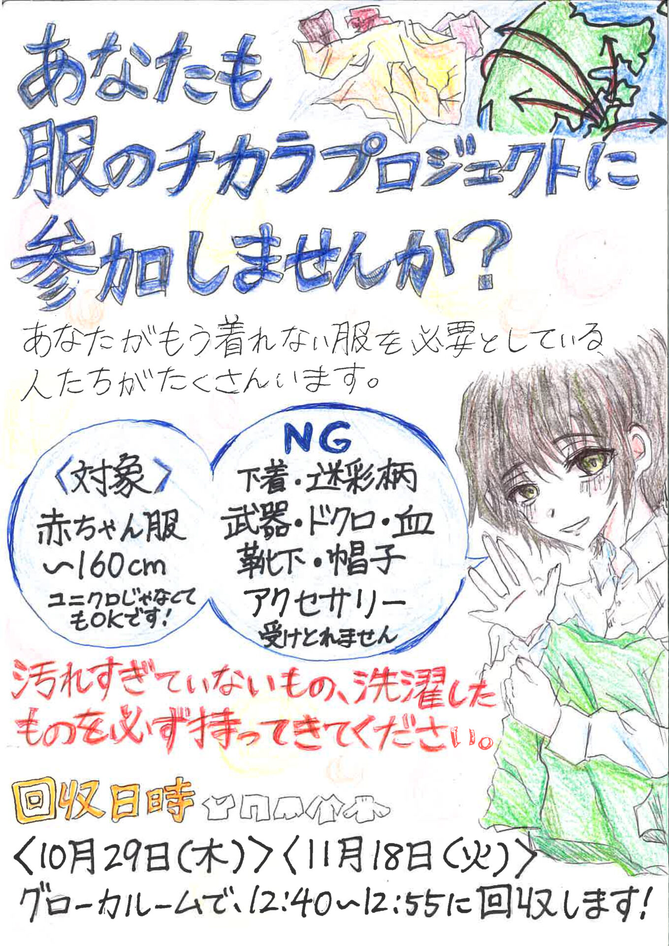 本校でも毎年の恒例行事となっている服のチカラプロジェクトが、今年も始まりました!