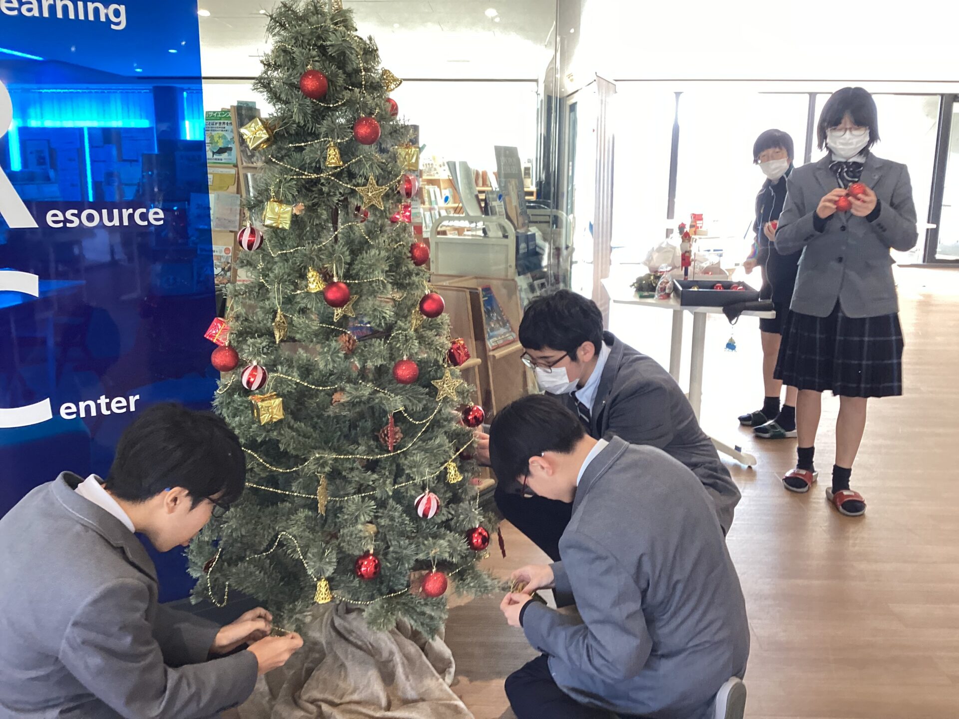 本日の昼休み、LRC(学校図書館)では、季節の展示を担当している中学図書委員が集まり、高さ180㎝のクリスマスツリーの飾りつけを行いました。鮮やかなオーナメントが次々と飾られ、LRC前は一気にクリスマス一色。中学図書委員の工夫と行動力が、LRCをより魅力的な空間にしてくれています。
