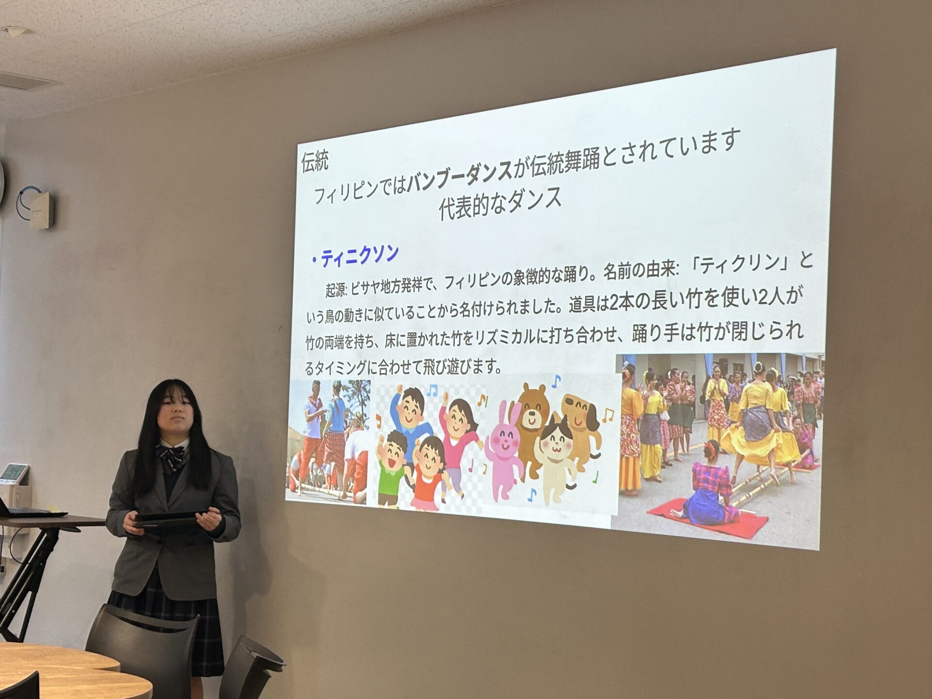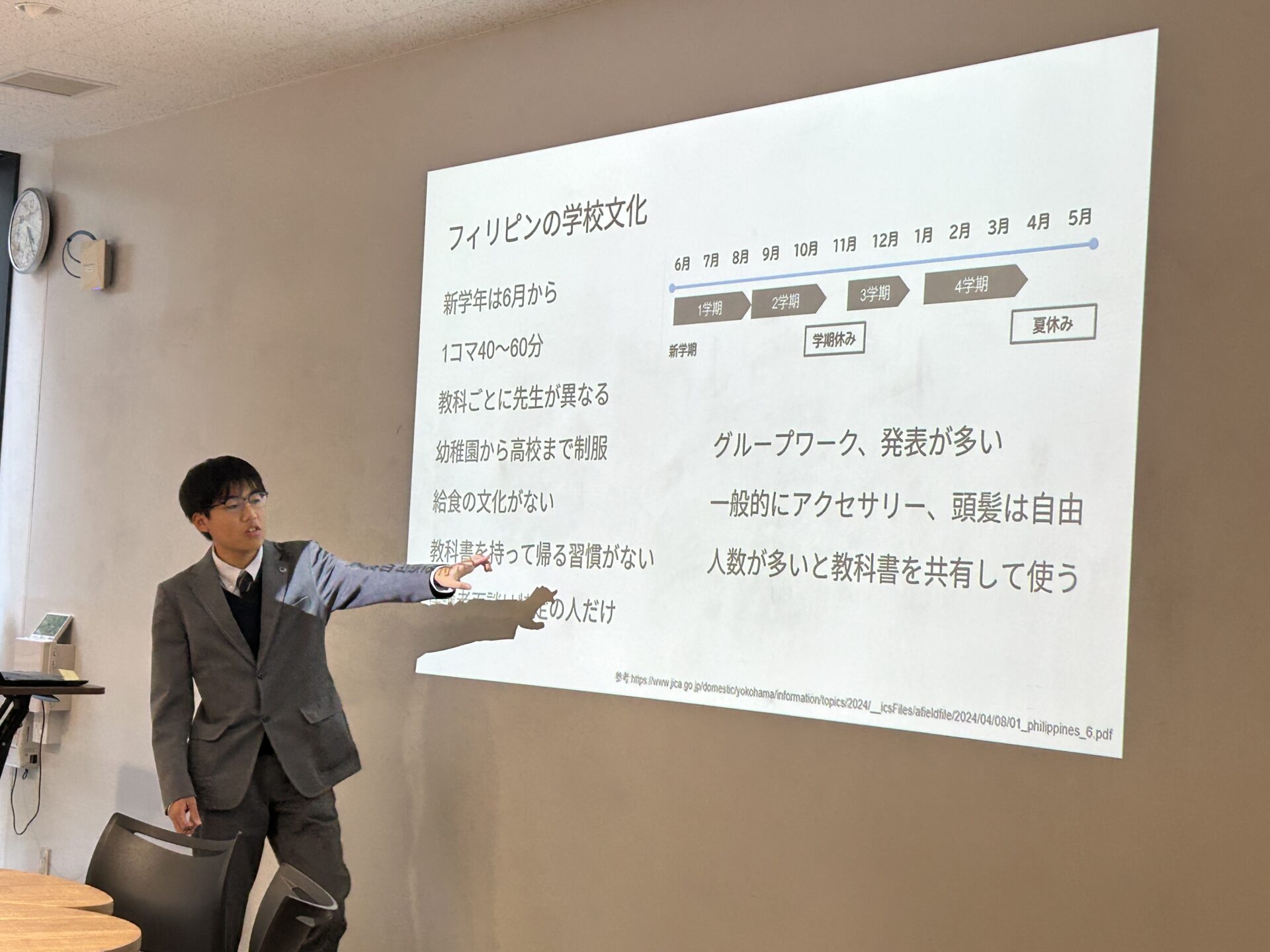 発表では、日本とフィリピンを比較しながら、自分なりの視点で調査を深めている様子がうかがえました。一人ひとりが現地での学びを意識して発表しており、研修への意欲が感じられる時間となりました。