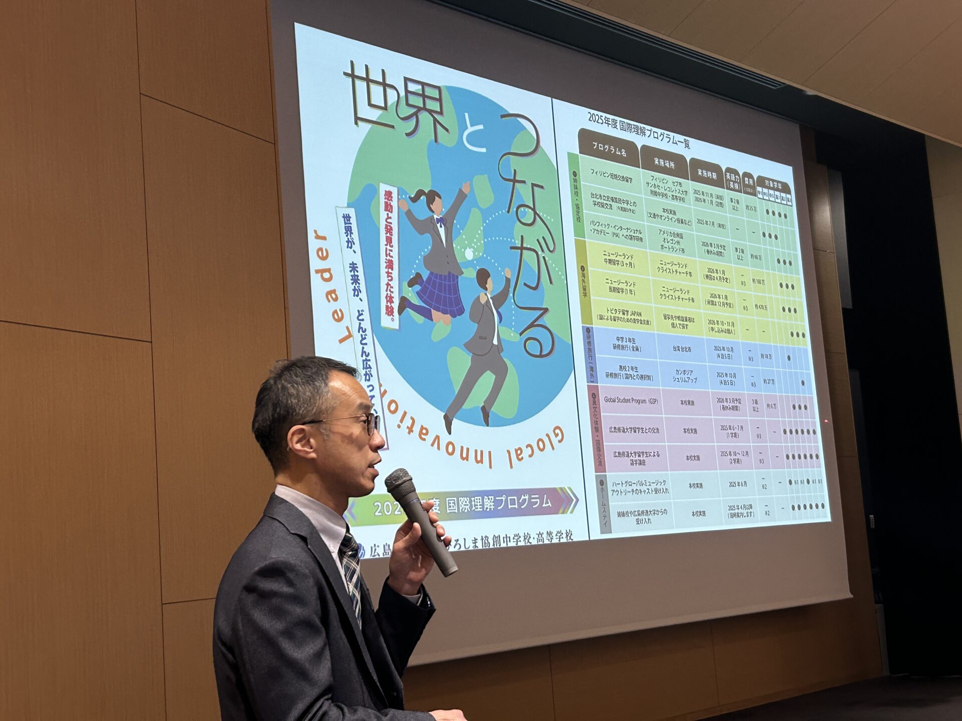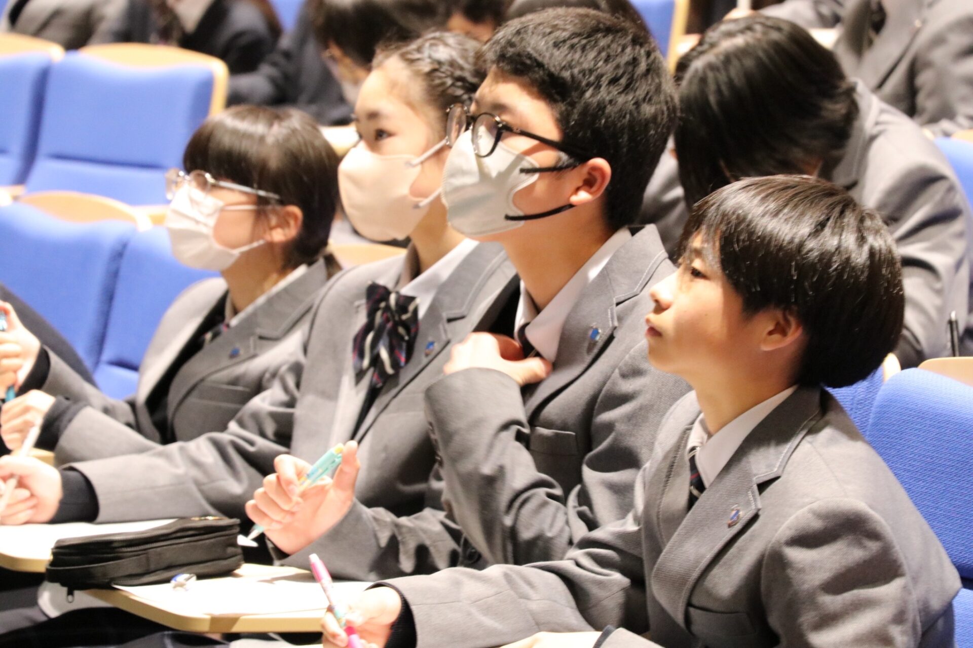 最後に中学教頭の新納先生から、高校接続や広島修道大学の附属校推薦についてのお話がありました。来年の4月、広島修道大学に広島県内の大学として初の農学部(仮称)が設置されることや、協創高校のコース制と附属校推薦の仕組み、一貫生の先輩の活躍なども紹介されました。中学生のうちから大学進学を意識して過ごせる環境は、中高一貫校の最大のメリットです。生徒の感想には「先輩方が話していた『何事にも全力で取り組む』を実践したい」「1日1日を計画的に過ごしたい」という言葉が見られました。先輩の活躍に負けないよう、「Aim High」の精神で日々を過ごしましょう。
