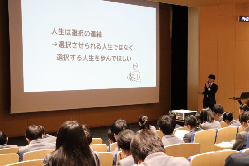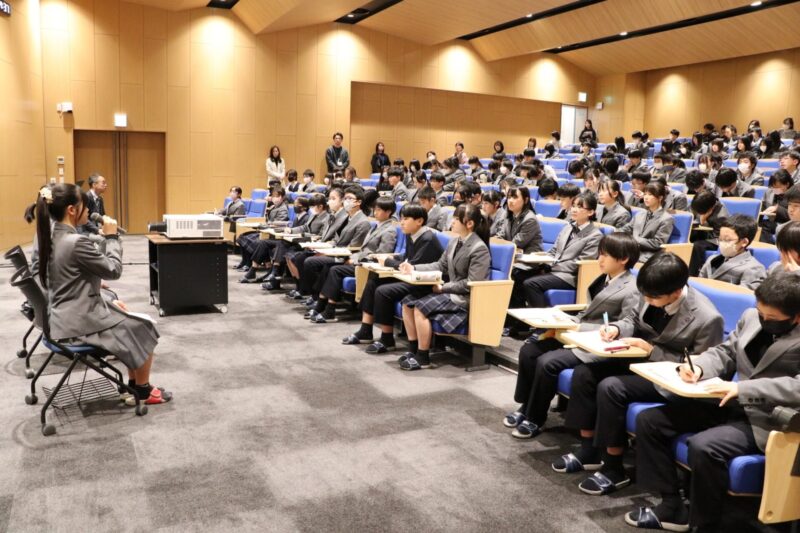 中盤は協創中学校の先輩でもあり、年内入試で大学に合格した朝山未来さんと石川未波さん(ともに現高校3年生)に来てもらい、「いつから大学受験を考え始めたのか」「高校に進学する前に意識すべきこと」「協創の良いところ」など、中高6年間を協創で過ごしたからこそ感じられることや伝えたいことを話してもらいました。2人の先輩の話している姿を見て、目を輝かせながらも真剣にメモをとる中学生の姿が印象的でした。