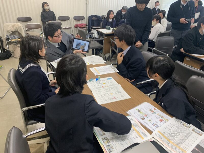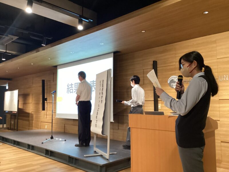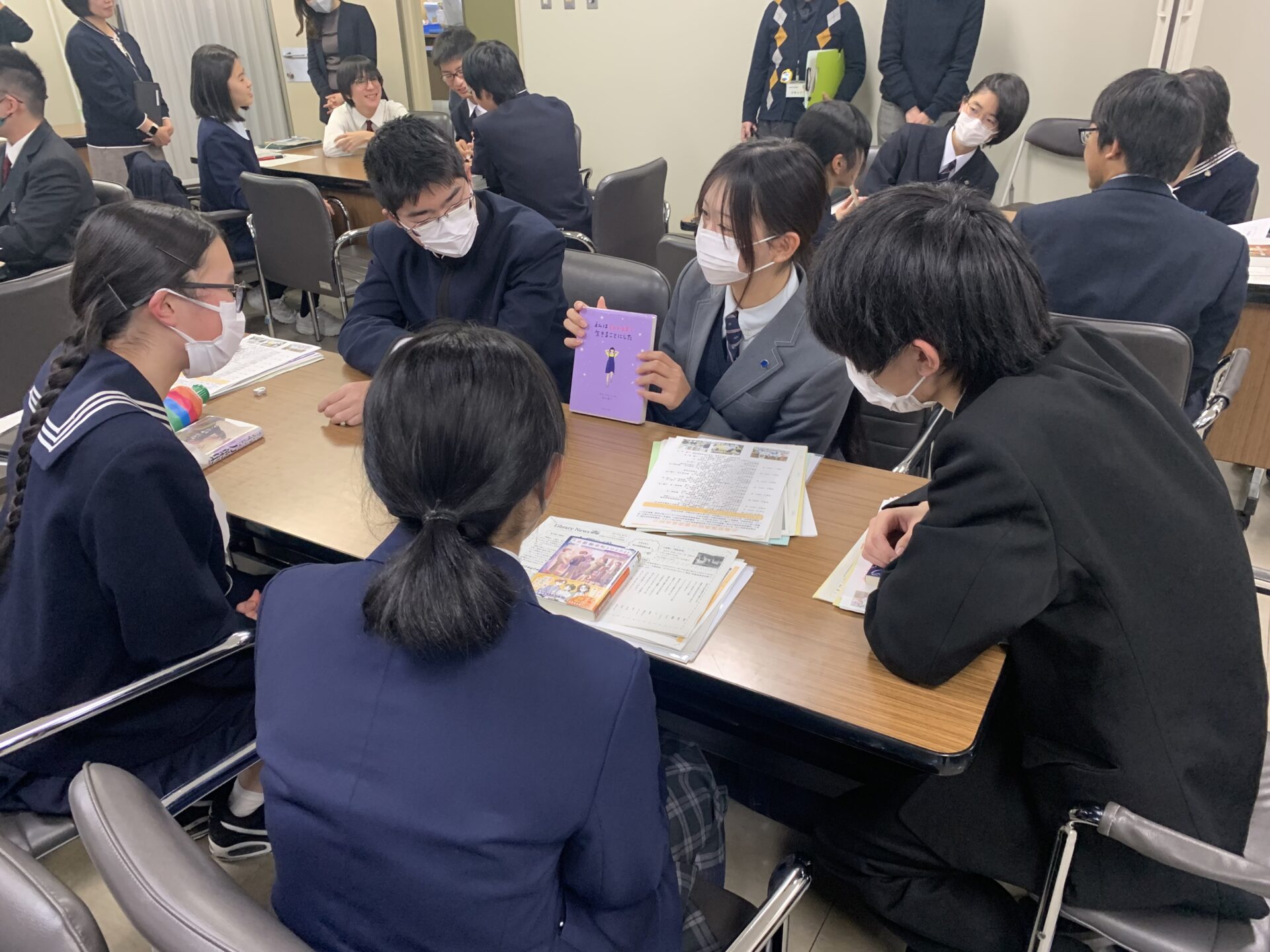 続いて、高校ビブリオバトル広島県大会に運営サポーターとして参加した高校1年の寺島さんと中学2年の亀甲さんが、ビブリオバトルの魅力や、他校の本好きの高校生と交流した経験について発表しました。さらに、高校2年の井口さんと大澤さんは、廣文館からいただいた「グリーンリボン」啓発のブックカバーを紹介しました。