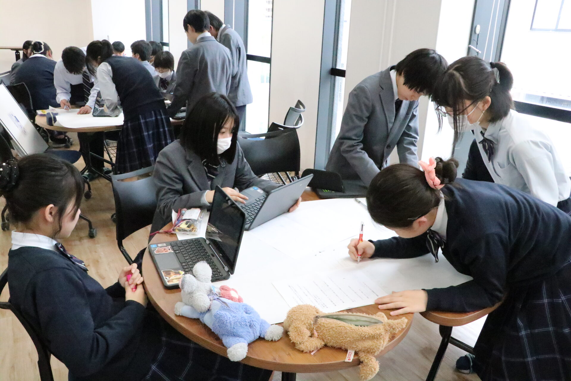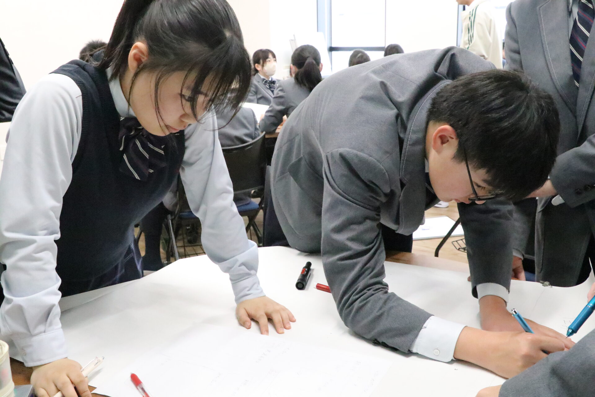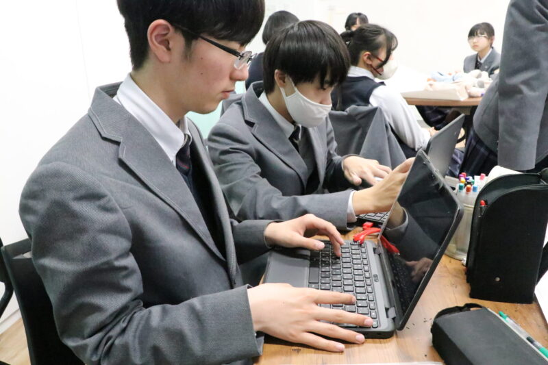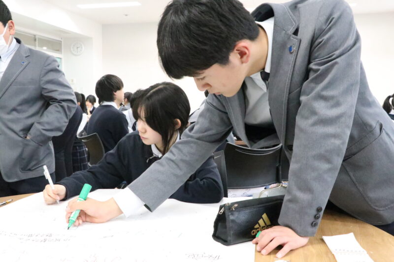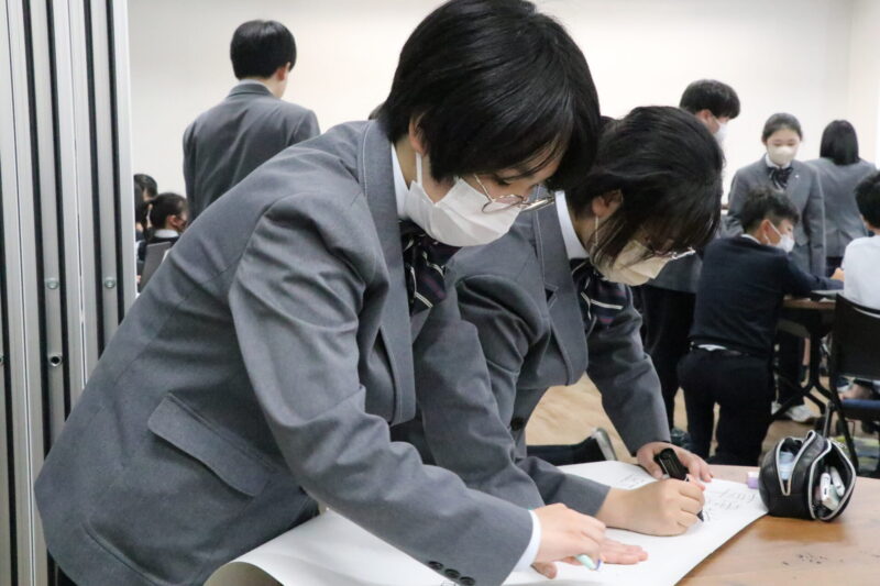 学校に帰ってからは発表に向けてポスターの作成です。事前に考えていた自分たちなりの考えと、地域の方々から聞いたインタビューの結果を踏まえ、改めて地域の魅力や課題について考え直していました。