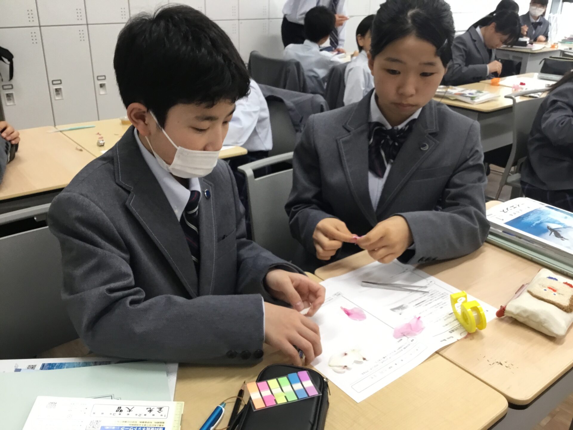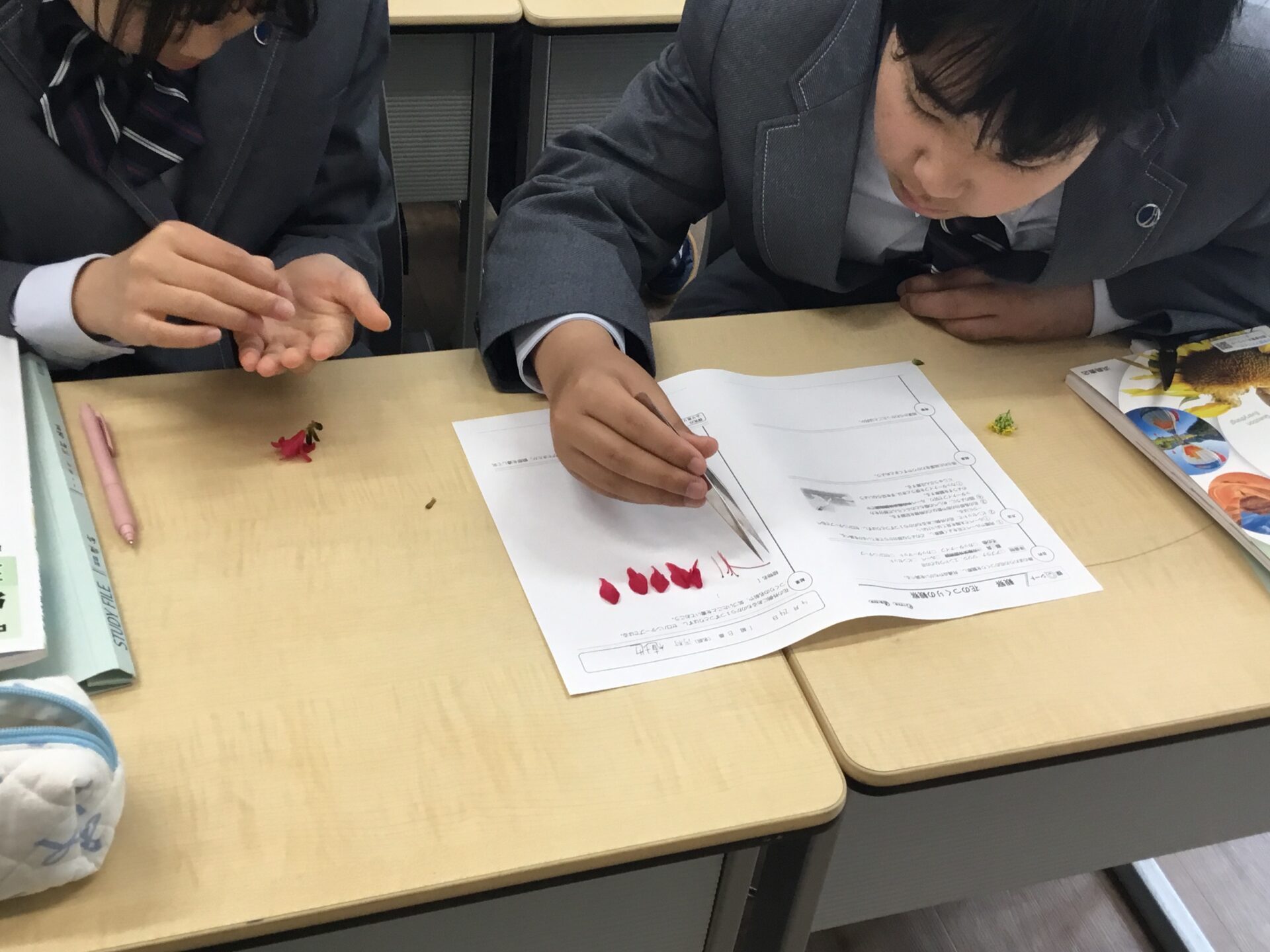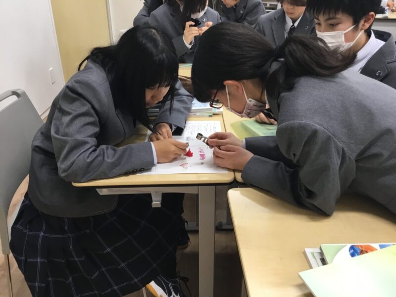 中学1年生理科の授業では校内の植物の観察を行いました。学校の許可をいただき、本校にあるたくさんの花の中からグループごとに選び採取しました。教室に戻り、ピンセットで外側から一つずつとりはずしルーペで観察し、台紙に貼って行きました。どのグループも協力して作業を進めることができていました。次の授業では、全員の結果をもとに共通点や相違点を考え、花のつくりについてまとめていきます。
